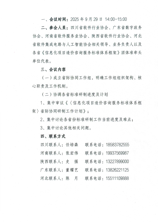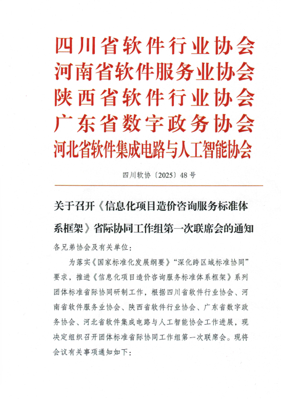 为落实《国家标准化发展纲要》“深化跨区域标准协同”要求,推进《信息化项目造价咨询服务标准体系框架》系列团体标准省际协同研制工作,根据四川省软件行业协会、河南省软件服务业协会、陕西省软件行业协会、广东省数字政务协会、河北省软件集成电路与人工智能协会工作进展,现决定于9月29日下午组织召开团体标准省际协同工作组第一次联席会。