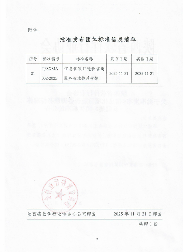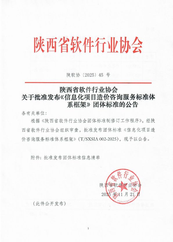 陕西省软件行业协会关于批准发布《信息化项目造价咨询服务标准体系框架》团体标准的公告