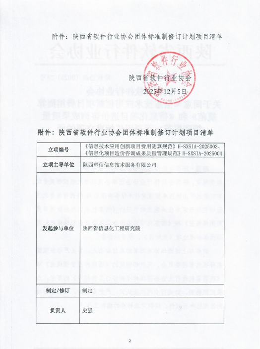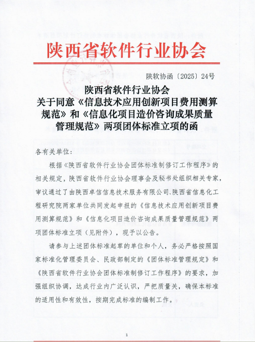 陕西省软件行业协会 关于同意《信息技术应用创新项目费用测算规范》和《信息化项目造价咨询成果质量 管理规范》两项团体标准立项的函
