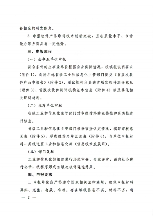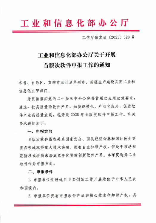 国家工信部于近期开展首版次软件申报工作,入目录后将进入央企采购清单,时间截止2026年1月16日,由于时间较紧,为保证各企业能及时申报,省工信厅将安排专家对有疑义企业进行专向辅导。有意向参与本年度申报工业软件方向的企业请积极给省软件协会报名,报名回执请于2025年12月29日下午三点前发邮件至1985388992@qq.com.