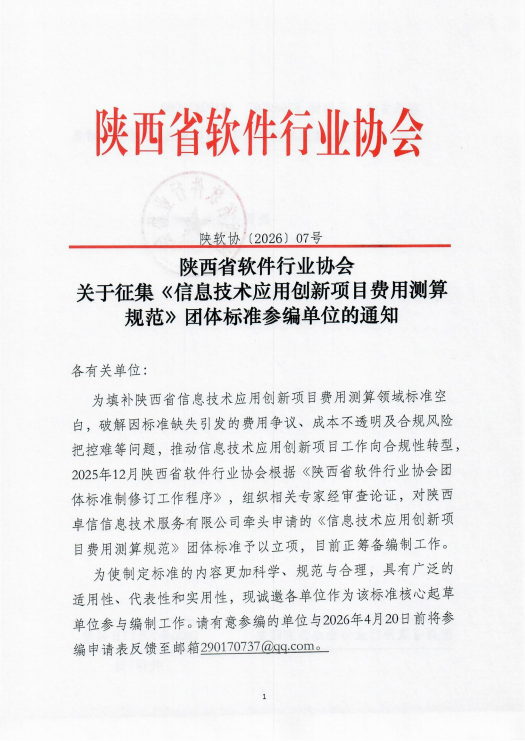 陕西省软件行业协会关于征集《信息技术应用创新项目费用测算规范》团体标准参编单位的通知
