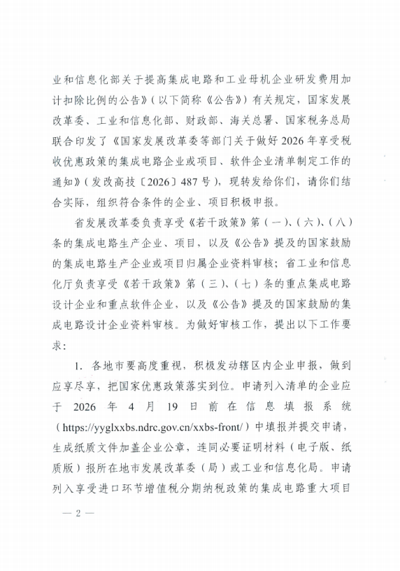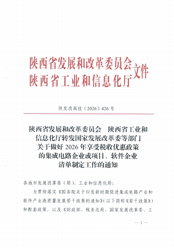 【转发通知】陕西省发展和改革委员会 陕西省工业和信息化厅转发国家发展改革委等部门关于做好2026年享受税收优惠政策的集成电路企业或项目、软件企业清单制定工作的通知