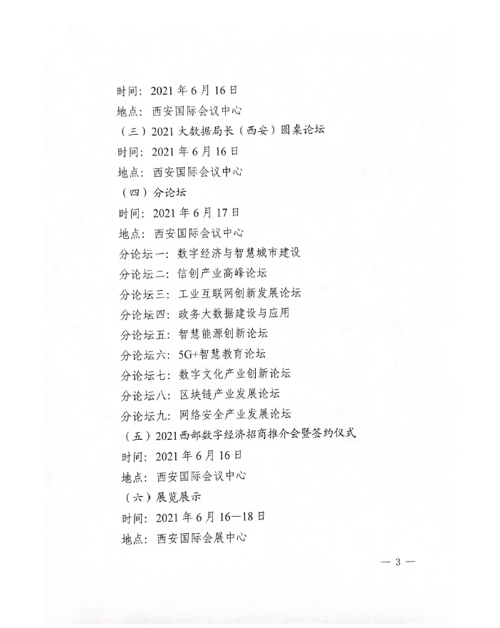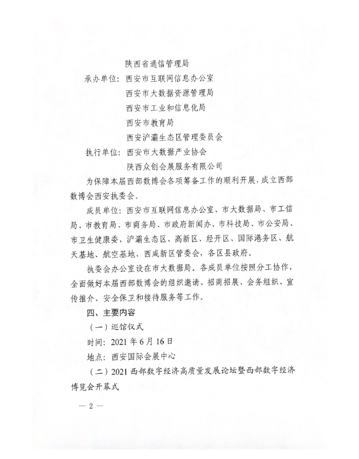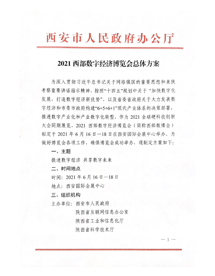 为深入贯彻习近平总书记关于网络强国的重要思想和来陕考察的重要指示精神,按照“十四五”规划中关于加快发展数字经济和构建现代产业体系的决策部署。由西安市人民政府、陕西省互联网信息办公室、陕西省工业和信息化厅、陕西省科学技术厅、陕西省通信管理局共同主办的2021西部数字经济博览会(以下简称:西部数博会)定于6月16日-18日在西安国际会展中心举办,博览会同期举办2021全球硬科技创新大会、西部数字经济高质量发展论坛、智慧城市、数字金融、网络安全与工业互联网分论坛等重要活动。